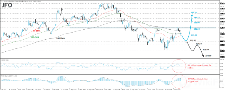 In order to escape the bearish case, we would like to see a dip below 323.40. This will confirm a forthcoming lower low on the 4-hour chart and may initially target the low of October 12th, at 317.50. Another dip, below 317.50, could pave the way toward the low of October 28th, at 308.00, the break of which could extend the fall towards the 298.00 zone, defined as a support by the low of May 12th.